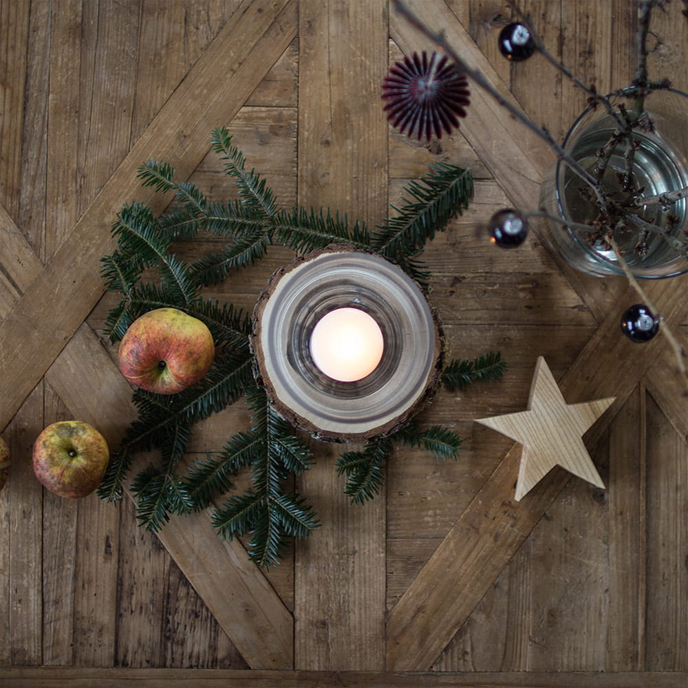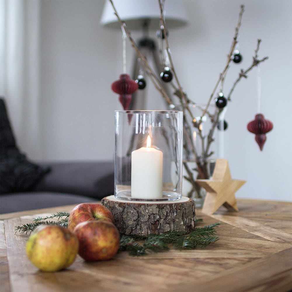 Natürliches Windlicht aus einer echten Baumscheibe mit Glasaufsatz. Das Kerzenlicht sorgt für eine warme, gemütliche Atmosphäre und passt perfekt zu einer natürlichen Wohn- und Tischdekoration.