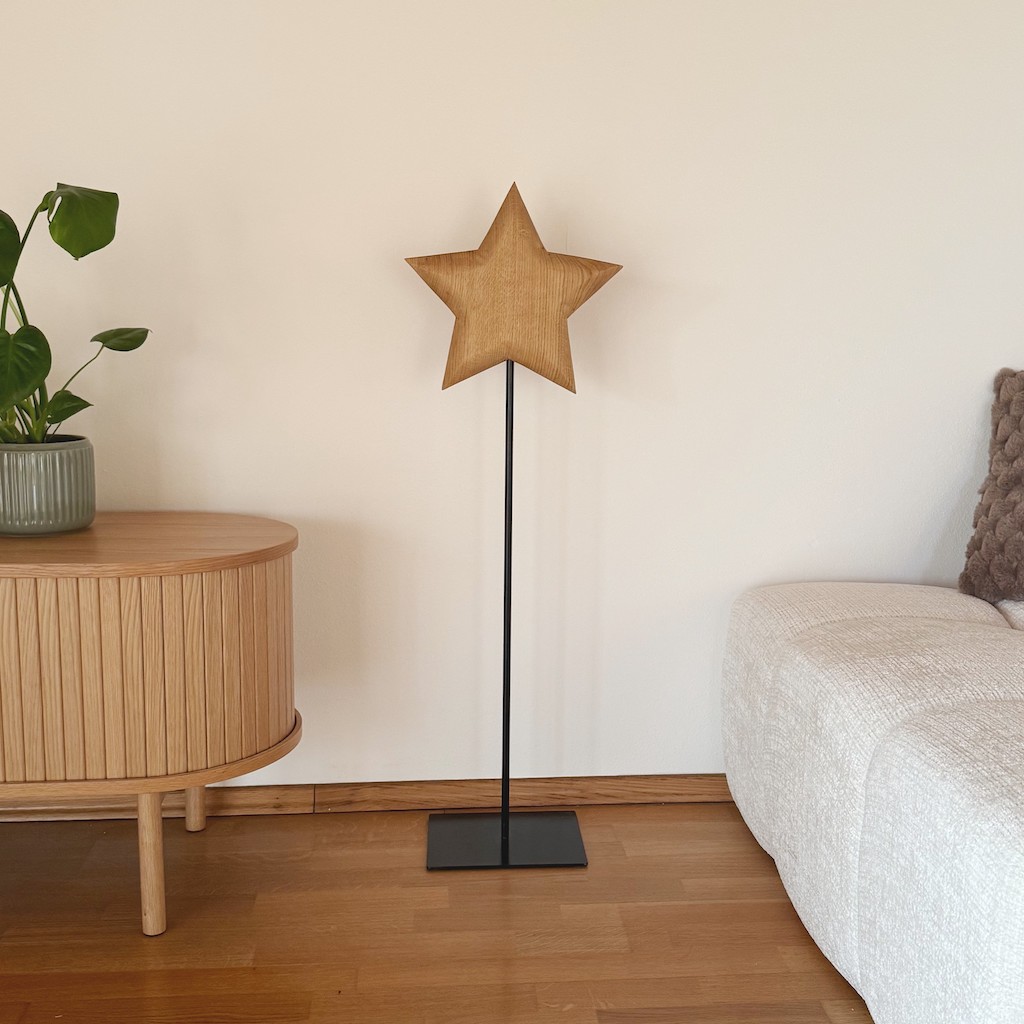 Jeder Holzstern ist ein Unikat, liebevoll von Hand ausgeschnitten und mit einem speziellen Fräser in Form gebracht. Der schlanke, schwarze Metallständer setzt den Stern modern in Szene – schlicht, aber wirkungsvoll.