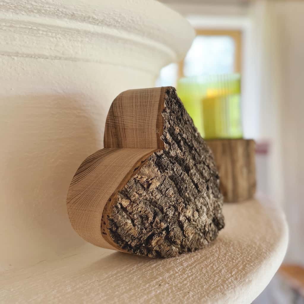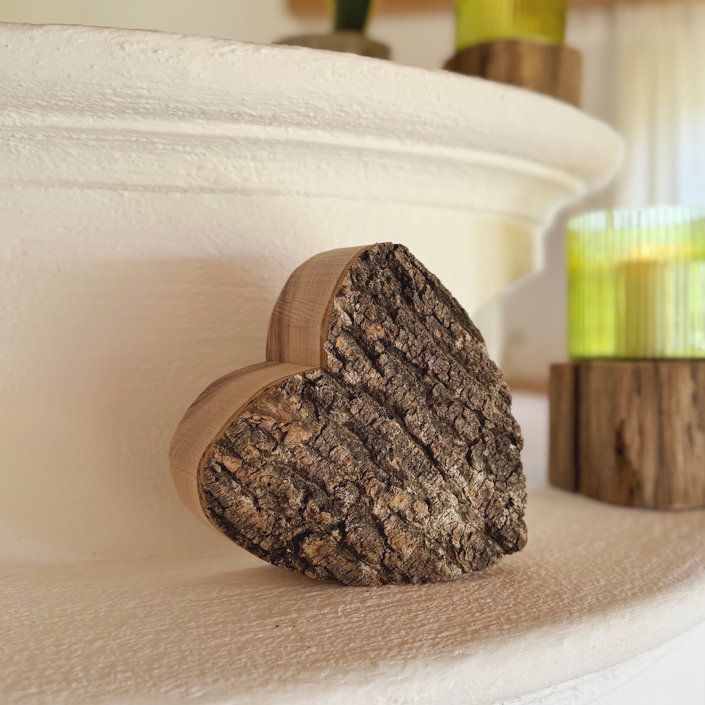 Besonderes Holzherz mit rustikaler Rinde und lebendiger Holzmaserung. Dieses dekorative Herz ist aus einem massiven Stück Eichenholz ausgeschnitten. Die Rinde auf der Vorderseite ist noch vollständig erhalten und in seinem natürlichen Zustand. Die Rückseite so wie die Kanten wurden fein verschliffen.